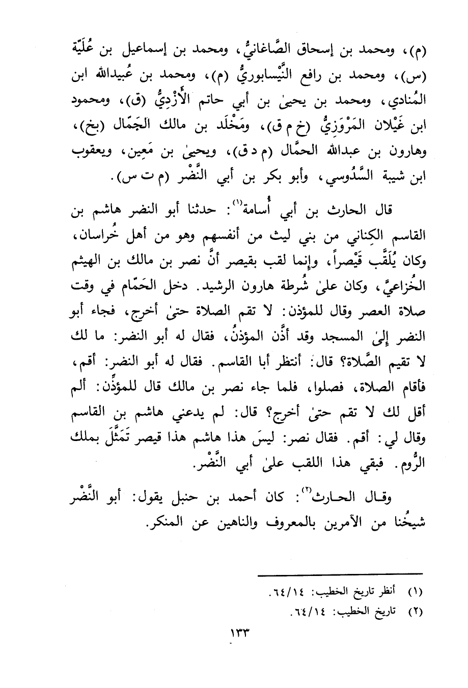 وَقَال الحارث (2) : كان أحمد بن حنبل يقول: أَبُو النضر شيخنا من الآمرين بالمعروف والناهين عَنِ المنكر.