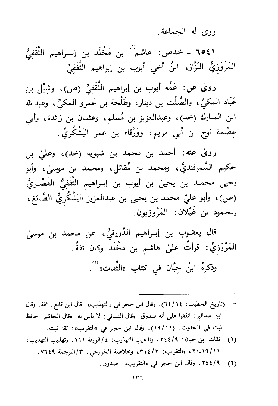 6541 - خدص: هاشم بْن مخلد بْن إِبْرَاهِيم الثقفي (1) المروزي البزاز، ابن أخي أيوب بن إبراهيم الثقفي.