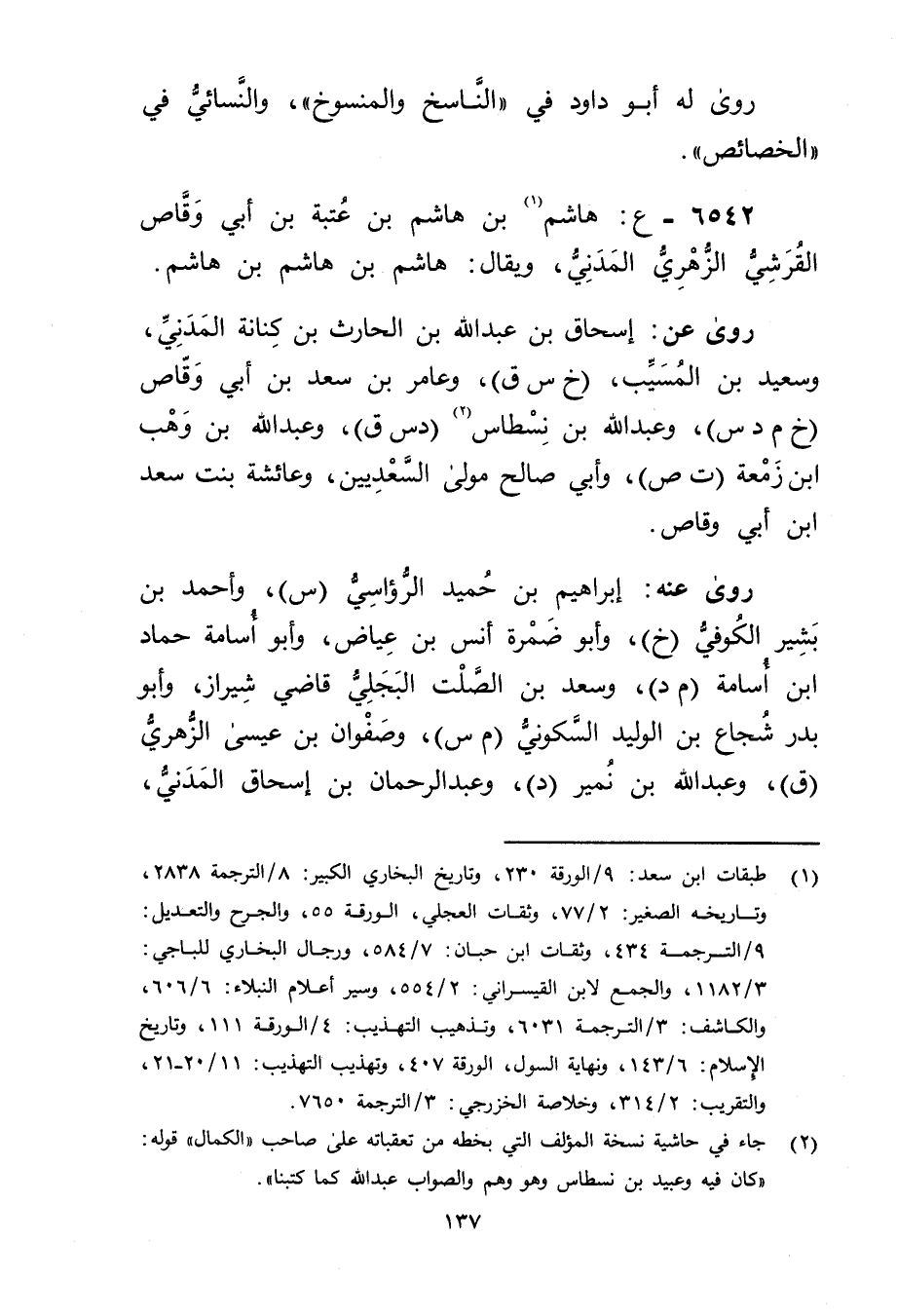 6542 - ع: هاشم بن هاشم بن عتبة بن أَبي وقاص القرشي الزُّهْرِيّ المدني (1) ، ويُقال: هاشم بن هاشم بن هاشم.