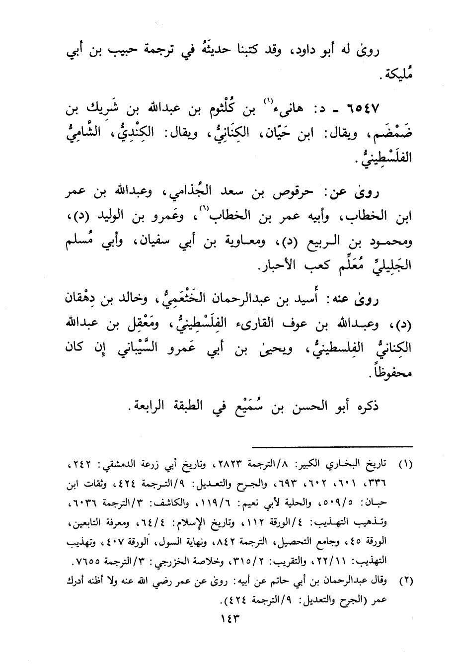 6547 - د: هانئ بن كلثوم بن عَبد الله بن شَرِيك بن ضمضم (1) ، ويُقال: ابن حيان، الكناني، ويُقال: الكندي، الشامي الفلسطيني.