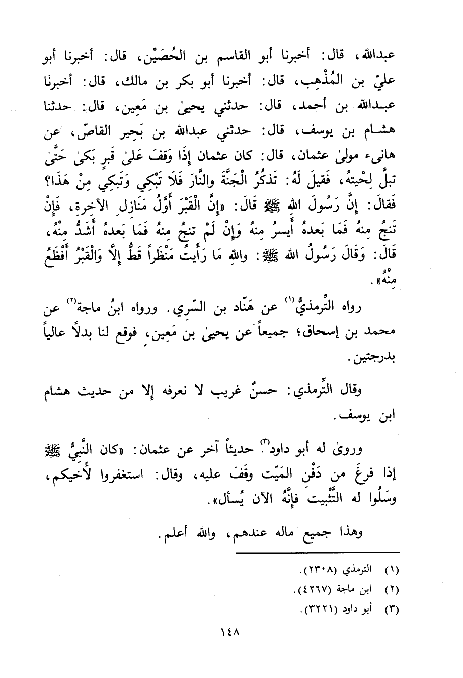 عَبد اللَّهِ، قال: أخبرنا أَبُو القاسم بْن الحصين، قال، أَخْبَرَنَا أبو علي بْن المذهب، قال: أَخْبَرَنَا أبو بكر بْن مالك، قال: أَخْبَرَنَا عَبد الله بْن أَحْمَدَ، قال: حَدَّثَنِي مُحَمَّدُ بْنُ مَعِين، قال: حَدَّثَنَا هِشَامُ بْنُ يُوسُفَ، قال: حَدَّثَنِي عَبد اللَّهِ بْنُ بَحِيرٍ الْقَاصُّ، عَنْ هَانِئٍ مَوْلَى عُثْمَانَ، قال: كَانَ عُثْمَانُ إِذَا وقَفَ عَلَى قَبْرٍ بَكَى حَتَّى تَبُلَّ لِحْيَتَهُ، فَقِيلَ لَهُ: تَذْكُرُ الْجَنَّةَ والنَّارَ فَلا تَبْكِي وتَبْكِي مِنْ هَذَا؟ فَقَالَ: إِنَّ رَسُول اللَّهِ صلى الله عليه وسَلَّمَ قال: إِنَّ الْقَبْرَ أَوَّلُ مَنَازِلِ الآخِرَةِ، فَإِنْ تَنْجُ مِنْهُ فَمَا بَعْدَهُ أَيْسَرُ مِنْهُ وإِنْ لَمْ تَنْجُ مِنْهُ فَمَا بَعْدَهُ أَشَدُّ مِنْهُ، قال: وَقَال رَسُولُ اللَّهِ صلى الله عليه وسلم: واللَّهِ مَا رَأَيْتُ مَنْظَرًا قَطُّ إِلا والْقَبْرُ أَفْظَعُ مِنْهُ.