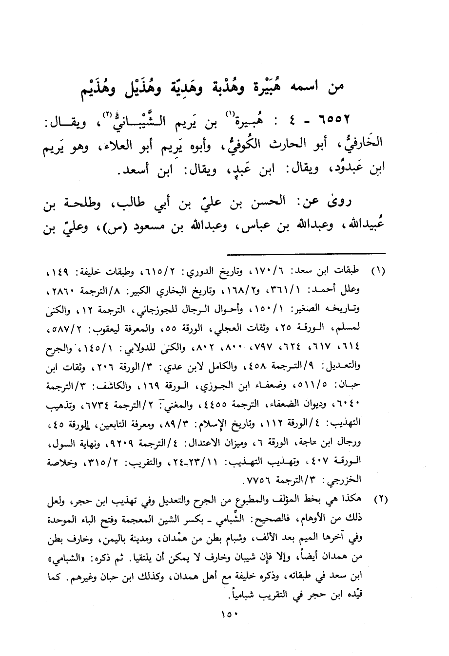 (2) هكذا هي بخط المؤلف والمطبوع من الجرح والتعديل وفي تهذيب ابن حجر، ولعل ذلك من الأَوهام، فالصحيح: الشبامي - بكسر الشين المعجمة وفتح الباء الموحدة وفي آخرها الميم بعد الالف، وشبام بطن من همدان، ومدينة باليمن، وخارف بطن من همدان أيضا، وإلا فإن شيبان وخارف لا يمكن أن يلتقيا. ثم ذكره: الشبامي" ابن سعد في طبقاته، وذكره خليفة مع أهل همدان، وكذلك ابن حبان وغيرهم. كما قيده ابن حجر في التقريب شباميا.