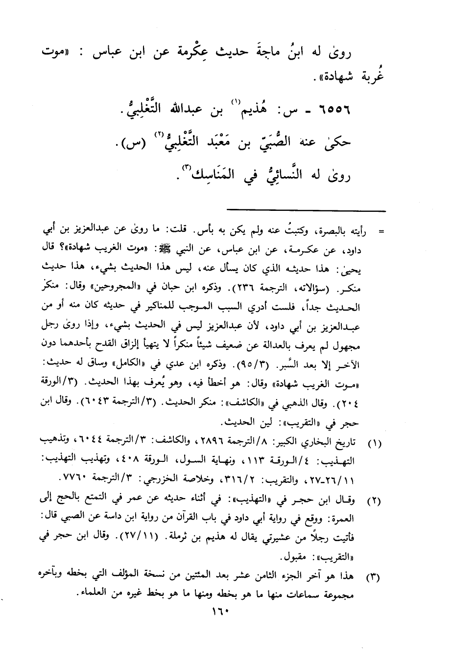 (1) تاريخ البخاري الكبير: 8 / الترجمة 2896، والكاشف: 3 / الترجمة 6044، وتذهيب التهذيب: 4 / الورقة 113، ونهاية السول، الورقة 408، وتهذيب التهذيب: 11 / 26 - 27، والتقريب: 2 / 316، وخلاصة الخزرجي: 3 / الترجمة 7760.