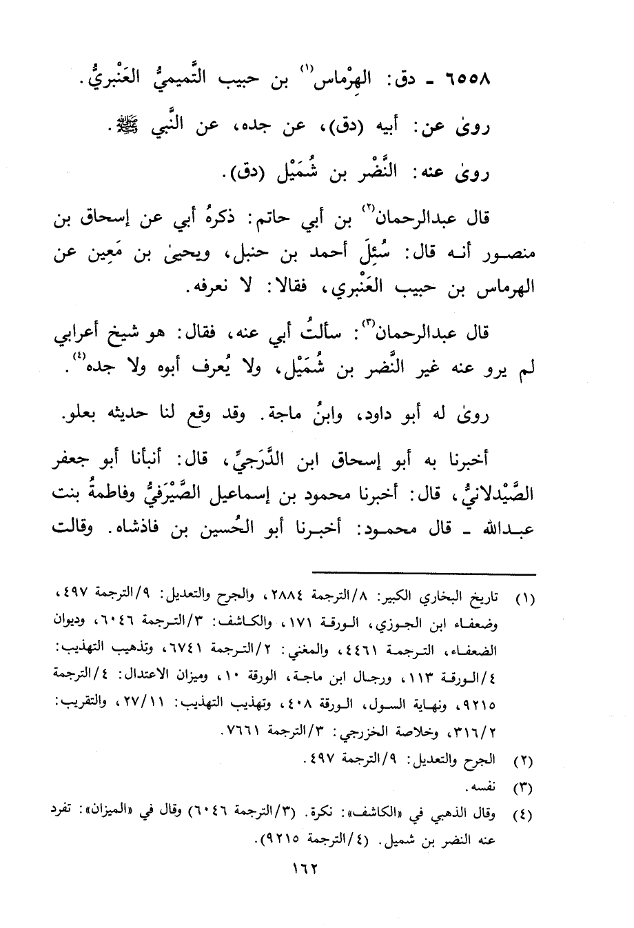 (4) وَقَال الذهبي في " الكاشف": نكرة. (3 / الترجمة 6046) وَقَال في " الميزان": تفرد عنه النضر بن شميل. (4 / الترجمة 9215) .