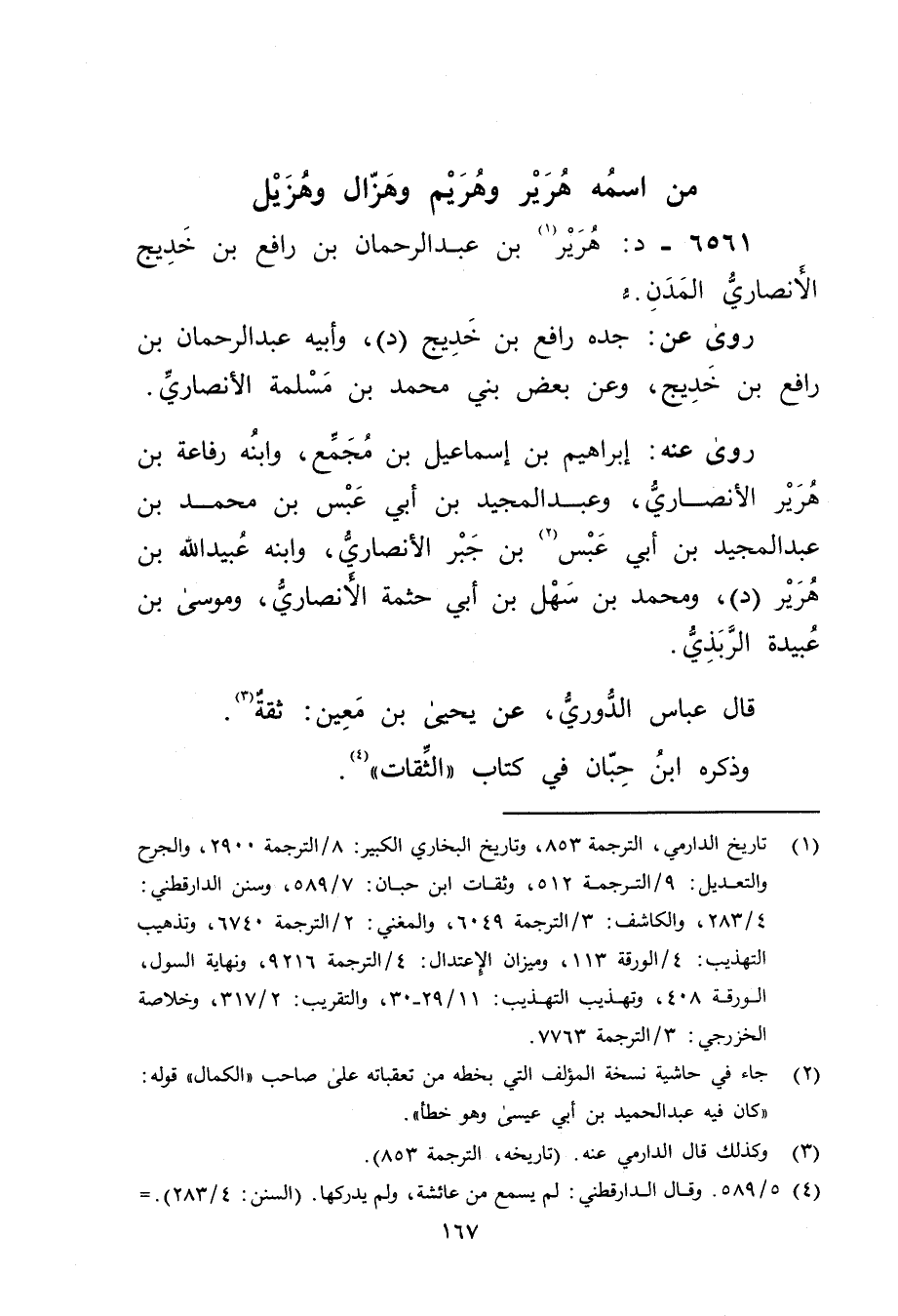 6561 - د: هرير بن عبد الرحمن بْن رافع بْن خديج الأَنْصارِيّ المدن (1) .