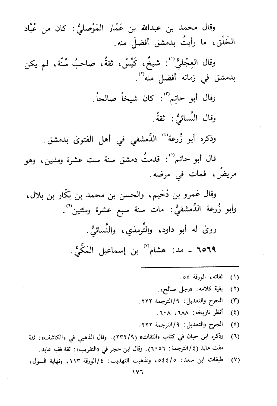 (6) وذكره ابنُ حِبَّان في كتاب "الثقات" (9 / 232) . وَقَال الذهبي في " الكاشف": ثقة مفت عابد (4 / الترجمة: 6056) . وَقَال ابن حجر في "التقريب": ثقة فقيه عابد.