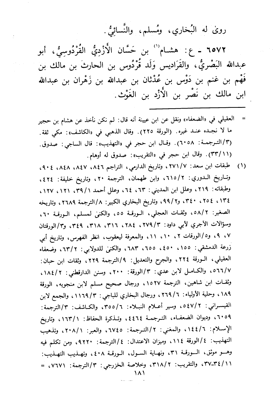 6572 - ع: هشام بن حسان الأزدي القردوسي (1) ، أَبُو عَبد الله البَصْرِيّ، والقراديس ولد قردوس بن الحارث بن مالك بن فهم بن غنم بن دوس بن عدثان بن عَبد الله بن زهران بْن عَبد اللَّهِ بْن مالك بن نصر بن الأزد بن الغوث.
