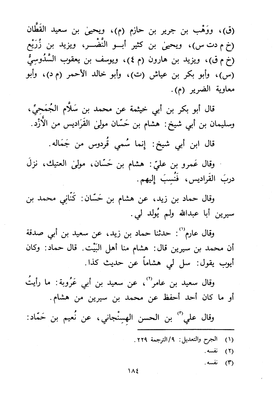 قال أَبُو بَكْر بْن أَبي خيثمة عَنْ مُحَمَّد بْن سَلام الجمحي، وسُلَيْمان بن أَبي شيخ: هشام بن حسان مولى القراديس من الأزد.