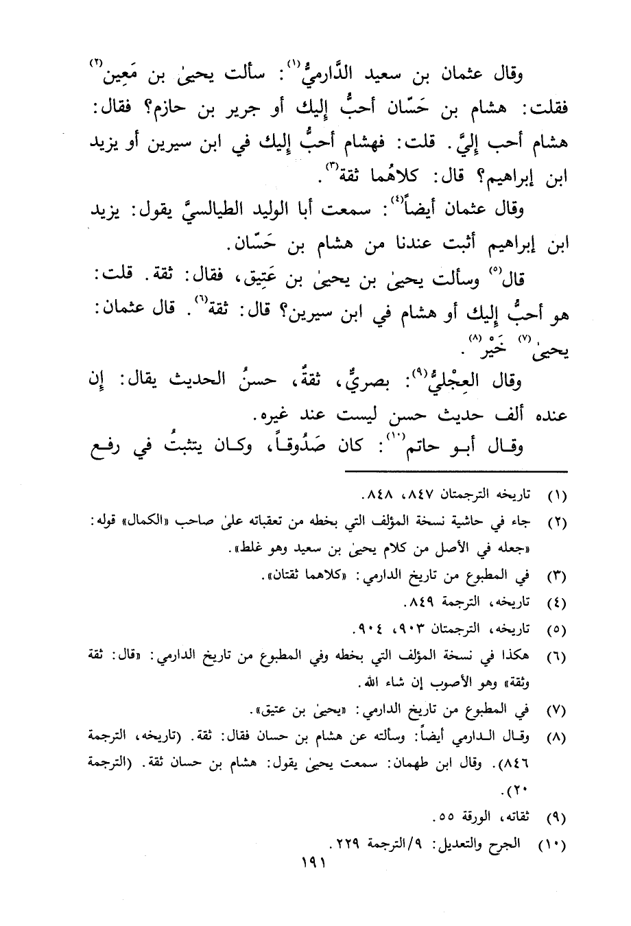 (8) وَقَال الدارمي أيضا: وسألته عن هِشَام بْن حَسَّان فَقَالَ: ثقة. (تاريخه، الترجمة 846) .