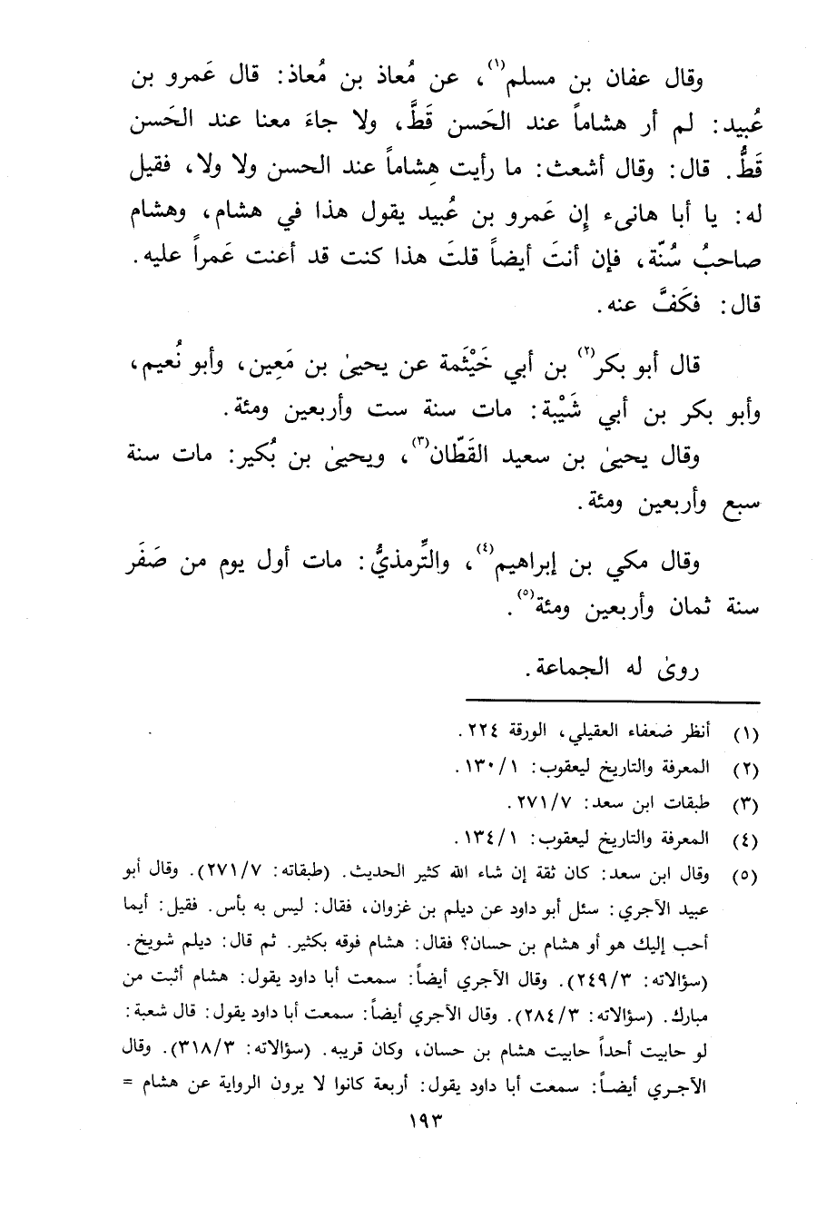 وَقَال عفان بْن مسلم (1) ، عن معاذ بن معاذ: قال عَمْرو بن عُبَيد: لم أر هشاما عند الحسن قط، ولا جاء معنا عند الحسن قط. قال: وَقَال أشعث: ما رأيت هشاما عند الحسن ولا ولا، فقيل له: يا أبا هانئ إن عَمْرو بن عُبَيد يقول هذا فِي هشام، وهشام صاحب سنة، فإن أنت أيضا قلت هذا كنت قد أعنت عُمَرا عليه. قال: فكف عنه.