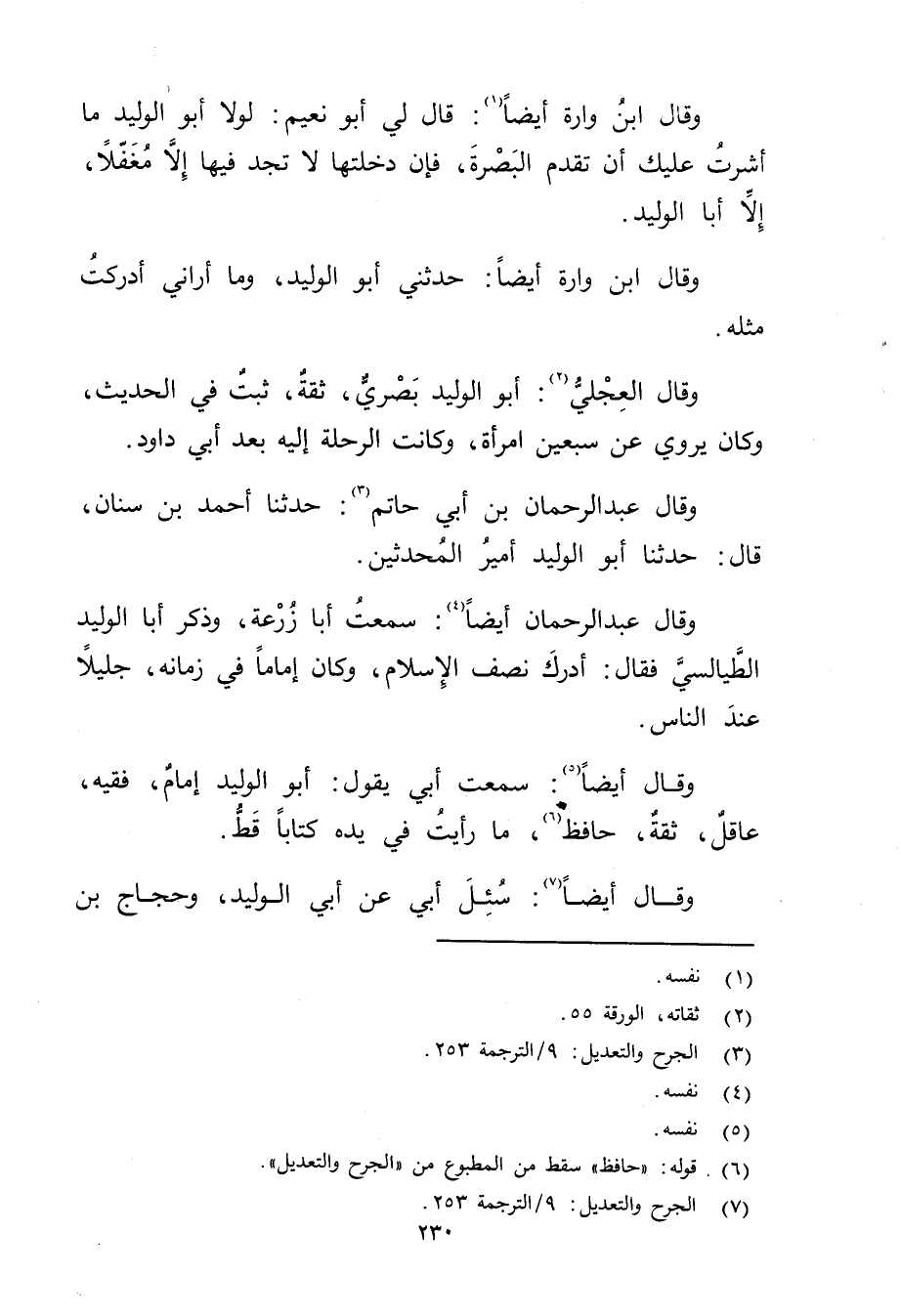 وَقَال عبد الرحمن أيضا (4) : سمعت أبا زرعة، وذكر أبا الوليد الطيالسي فَقَالَ: أدرك نصف الإسلام، وكان إماما فِي زمانه، جليلا عند الناس.