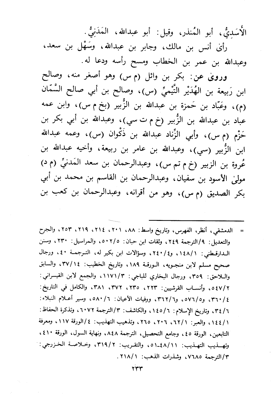 = الدمشقي، أنظر، الفهرس، وتاريخ واسط: 88، 201، 214، 219، 253، والجرح والتعديل: 9 / الترجمة 249، وثقات ابن حبان: 5 / 502، والمراسيل: 230 وسنن الدَّارَقُطنِيّ: 1 / 148، و4 / 240، وسؤالات ابن بكير له، الترجمة 40، ورجال صحيح مسلم لابن منجويه، الورقة 189، وتاريخ الخطيب: 14 / 37، والسابق واللاحق: 359، ورجال البخاري للباجي: 3 / 1171، والجمع لابن القيسراني: 2 / 547، وأنساب القرشيين: 223، 235، 372، 381، والكامل في التاريخ: 4 / 360، و5 / 576، و6 / 362، ووفيات الاعيان: 6 / 580، وسير أعلام النبلاء: 6 / 34، وتاريخ الاسلام: 6 / 145، والكاشف: 3 / الترجمة 6072، وتذكرة الحفاظ: 1 / 144، والعبر: 1 / 62، 206، 265، وتذهيب التهذيب: 4 / الورقة 117، ومعرفة التابعين، الورقة 45، وجامع التحصيل، الترجمة 848، ونهاية السول، الورقة 410، وتهذيب التهذيب: 11 / 48 - 51، والتقريب: 2 / 319، وخلاصة الخزرجي: 3 / الترجمة 7685، وشذرات الذهب: 1 / 218.