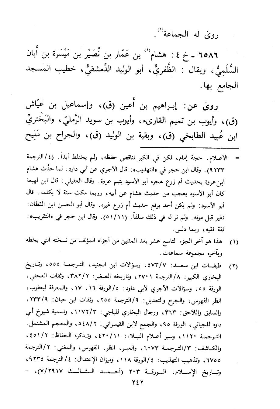 6586 - خ 4: هشام بن عمار بن نصير بن ميسرة بن أبان السلمي (2) ، ويُقال: الظفري، أَبُو الوليد الدمشقي، خطيب المسجد الجامع بها.