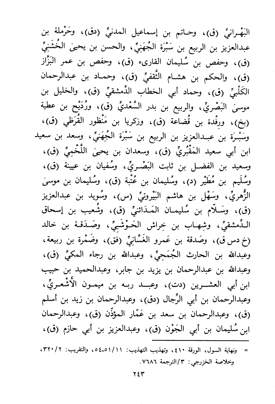= ونهاية السول، الورقة 410، وتهذيب التهذيب: 11 / 51 - 54، والتقريب: 2 / 320، وخلاصة الخزرجي: 3 / الترجمة 7686.
