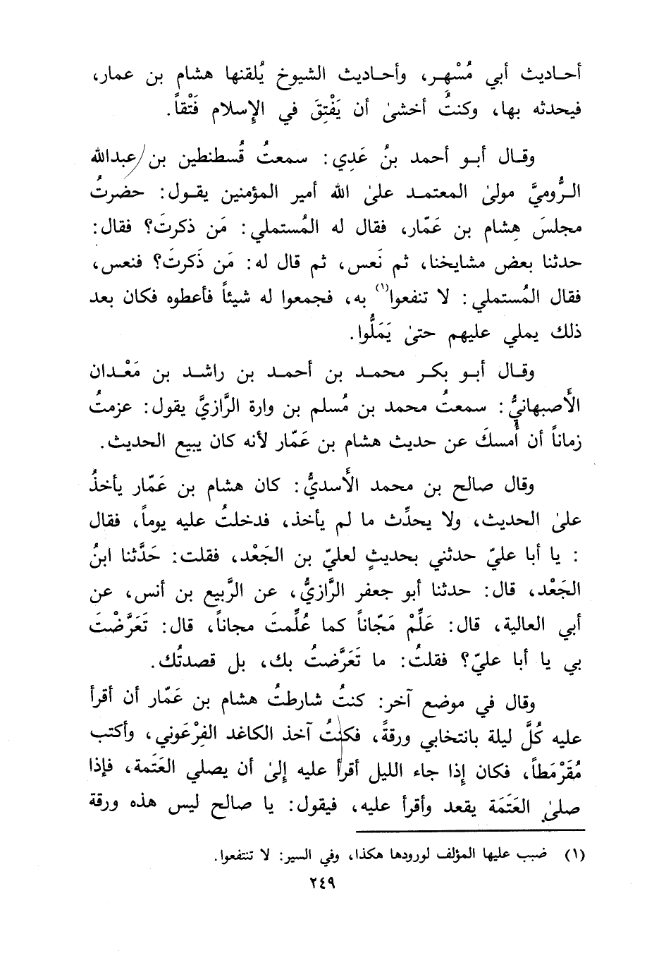 وَقَال أَبُو أحمد بن عدي: سمعت قسطنطين بْن عَبد اللَّهِ الرومي مولى المعتمد عَلَى الله أمير المؤمنين يقول: حضرت مجلس هشام بن عمار، فَقَالَ له المستملي: من ذكرت؟ فَقَالَ: حَدَّثَنَا بعض مشايخنا، ثم نعس، ثم قال له: من ذكرت؟ فنعس، فَقَالَ المستملي: لا تنفعوا (1) به، فجمعوا له شيئا فأعطوه فكان بعد ذلك يملي عليهم حتى يملوا.