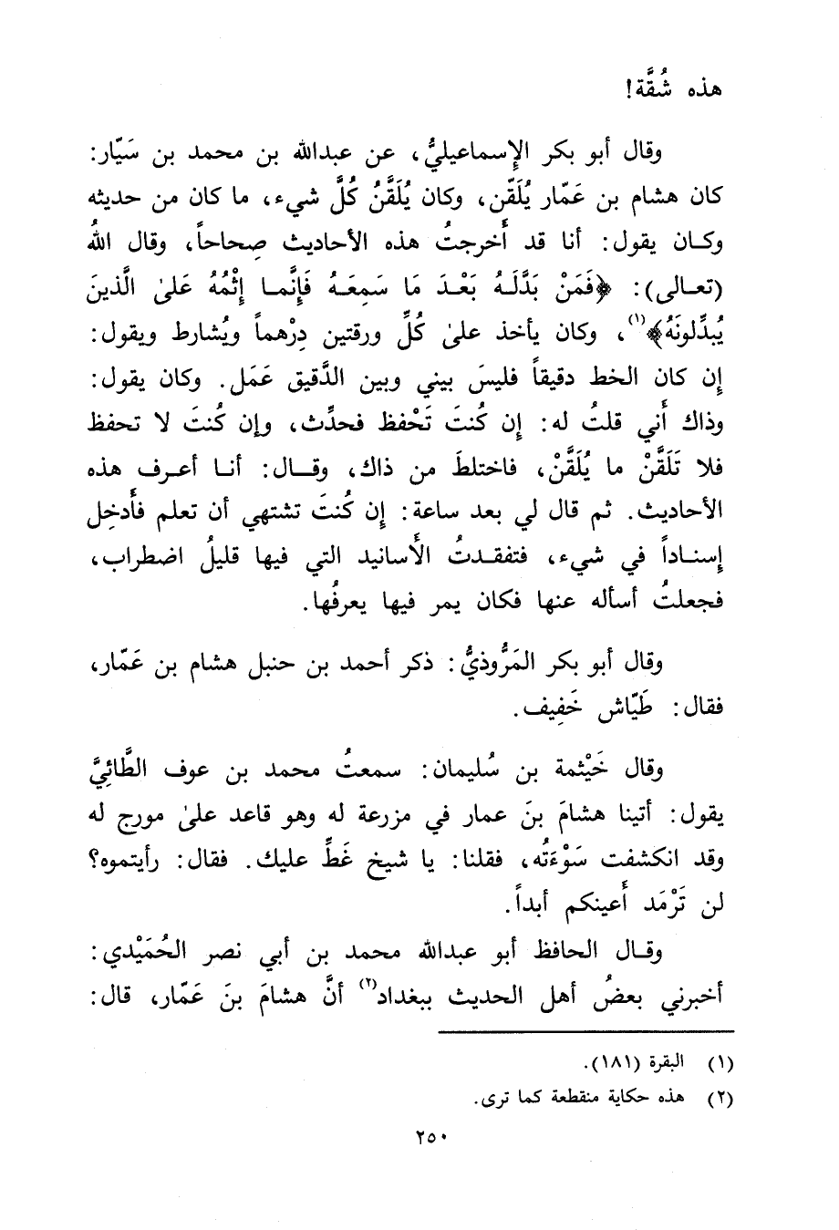 هذه شقة! وَقَال أَبُو بَكْر الإِسماعيلي، عَنْ عَبد الله بن محمد بن سيار: كان هشام بن عمار يلقن، وكان يلقن كان شيء، ما كان من حديثه وكان يقول: أنا قد أخرجت هذه الأحاديث صحاحا، وَقَال الله (تعالى) : (فمن بدله بعد ما سمعه فإنما إثمه عَلَى الذين يبدلونه) (1) ، وكان يأخذ عَلَى كل ورقتين درهما ويشارط ويقول: