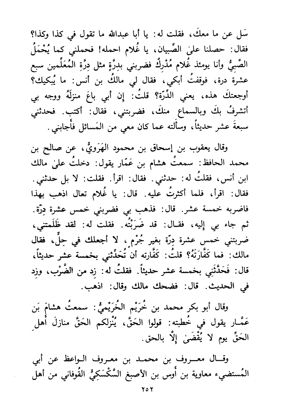 سل عَنْ ما معك، فقلت لَهُ: يا أَبَا عَبد اللَّهِ ما تقول فِي كذا وكذا؟ فَقَالَ: حصلنا عَلَى الصبيان، يا غلام احمله! فحملني كما يحمل الصبي وأنا يومئذ غلام مدرك فضربني بدرة مثل درة المعلمين سبع عشرة درة، فوقفت أبكي، فَقَالَ لي مالك بن أنس: ما يبكيك؟ أوجعتك هذه، يعني الدرة؟ قلت: إن أبي باع منزله ووجه بي أتشرف بك وبالسماع منك، فضربتني، فَقَالَ: اكتب. فحَدَّثَنِي سبعة عشر حديثا، وسألته عما كان معي من المسائل فأجابني.