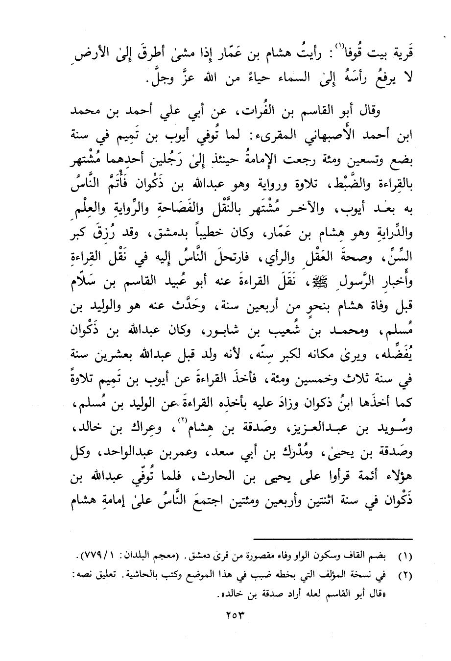 وَقَال أَبُو القاسم بن الفرات، عَن أبي علي أحمد بن محمد ابن أحمد الأصبهاني المقرئ: لما توفي أيوب بن تميم فِي سنة بضع وتسعين ومئة رجعت الإمامة حينئذ إِلَى رجلين أحدهما مشتهر بالقراءة والضبط، تلاوة ورواية وهو عَبد الله بن ذكوان فأتم الناس به بعد أيوب، والآخر مشتهر بالنقل والفصاحة والرواية والعلم والدراية وهو هشام بن عمار، وكان خطيبا بدمشق، وقد رزق كبر السن، وصحة القعل والرأي، فارتحل الناس إليه فِي نقل القراءة وأخبار الرسول صَلَّى اللَّهُ عليه وسلم، نقل القراءة عنه أَبُو عُبَيد القاسم بن سلام قبل وفاة هشام بنحو من أربعين سنة، وحدث عنه هو والوليد بن مسلم، ومحمد بن شعيب بن شابور، وكان عَبد الله بن ذكوان يفضله، ويرى مكانه لكبر سنه، لأنه ولد قبل عَبد الله بعشرين سنة فِي سنة ثلاث وخمسين ومئة، فأخذ القراءة عَنْ أيوب بن تميم تلاوة كما أخذها ابن ذكوان وزاد عليه بأخذه القراءة عَنِ الوليد بن مسلم، وسويد بْن عَبْد العزيز، وصدقة بْن هشام (2) ، وعراك بن خالد، وصدقة بن يحيى، ومدرك بن أَبي سعد، وعُمَر بن عبد الواحد، وكل هؤلاء أئمة قرأوا عَلَى يحيى بن الحارث، فلما توفي عَبد الله بن ذكوان فِي سنة اثنتين وأربعين ومئتين اجتمع الناس عَلَى إمامة هشام