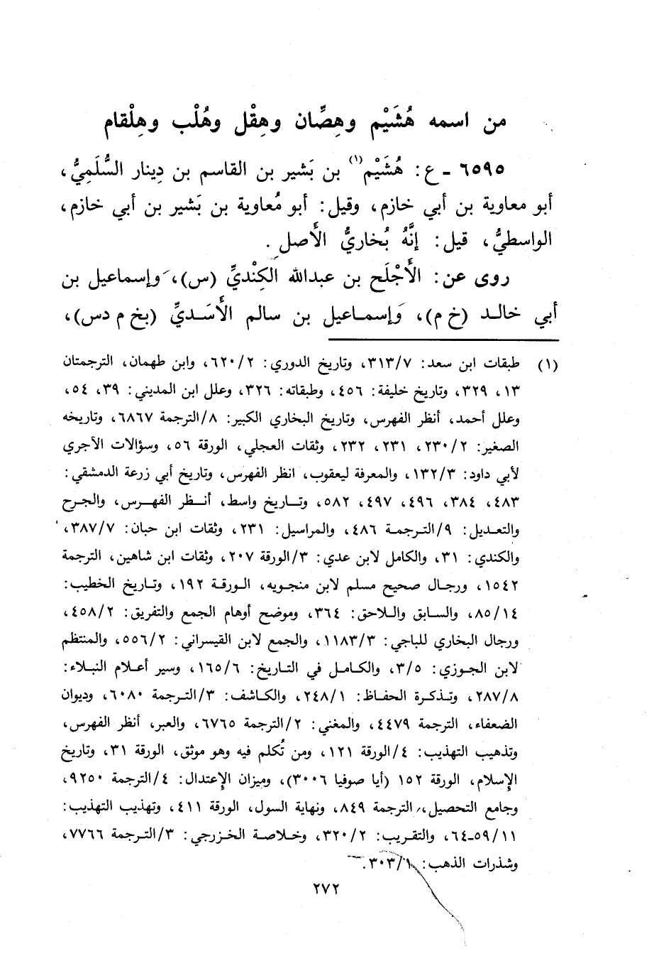 6595 - ع: هشيم بن بشير بن القاسم بن دينار السلمي (1) ، أَبُو معاوية بن أَبي خازم، وقيل: أَبُو معاوية بن بشير بن أَبي خازم، الواسطي، قيل: إنه بخاري الأصل.