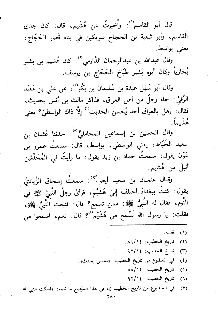وَقَال عُثْمَان بْن سَعِيد أَيْضًا (6) : سمعت إسحاق الزيادي يقول: كنت ببغداد أختلف إِلَى هشيم، فرأى رجل النَّبِيّ صَلَّى اللَّهُ عليه وسلم فِي النوم، فَقَالَ له النَّبِيُّ صلى الله عليه وسلم: ممن تسمع؟ قال: فتبعت النَّبِيّ صَلَّى اللَّهُ عَلَيْهِ وسَلَّمَ، فَقُلْتُ: يارسول اللَّهِ نسمع من هشيم (7) ؟ قال: نعم، اسمعوا من