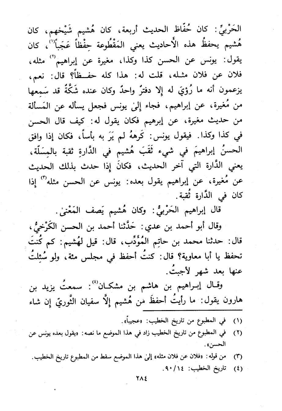 الحربي: كان حفاظ الحديث أربعة، كان هشيم شيخهم، كان هشيم يحفظ هذه الأحاديث يعني المقطوعة حفظا عجبا (1) ، كان يقول: يونس عَنِ الحسن كذا وكذا، مغيرة عَنْ إبراهيم (2) مثله، فلان عَنْ فلان مثله، قلت له: هذا كله حفظا؟ قال: نعم، يزعمون أنه ما رؤي له إلا دفتر واحد وكان عنده شكة قد سمعها من مغيرة، عَنْ إبراهيم، فجاء إِلَى يونس فجعل يسأله عَنِ المسألة من حديث مغيرة، عَنْ إبراهيم فكان يقول له: كيف قال الحسن فِي كذا وكذا. فيقول يونس: كرهه لم ير به بأسا، فكان إذا وافق الحسن إبراهيم فِي شيء ثقب هشيم فِي الدارة ثقبة بالمسلة، يعني الدارة التي آخر الحديث، فكان إذا حدث بذلك الحديث عَنْ مغيرة، عَنْ إبراهيم يقول بعده: يونس عَنِ الحسن مثله (3) إذا كان فِي الدارة ثقبة.