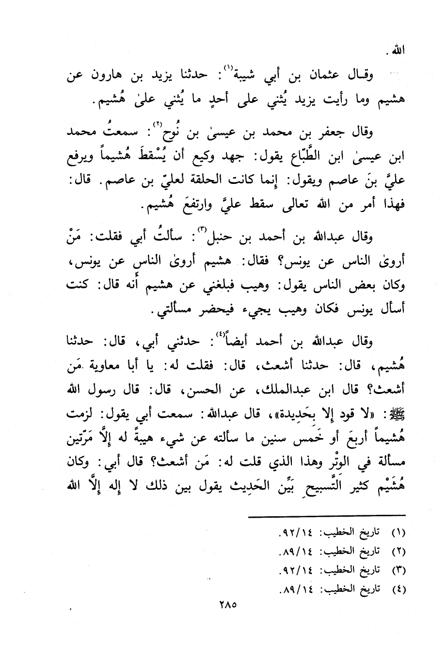 وَقَال عثمان بن أَبي شَيْبَة (1) : حَدَّثَنَا يزيد بْن هارون عَنْ هشيم وما رأيت يزيد يثني عَلَى أحد ما يثني عَلَى هشيم.