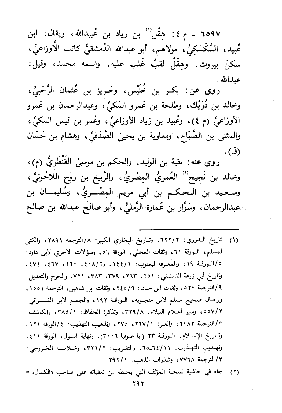 6597 - م 4: هقل بن زياد بن عُبَيد الله (1) ، ويُقال: ابن عُبَيد، السكسكي، مولاهم، أَبُو عبد الله الدمشقي كاتب الأَوزاعِيّ، سكن بيروت. وهقل لقب غلب عليه، واسمه محمد، وقيل: عَبد الله.