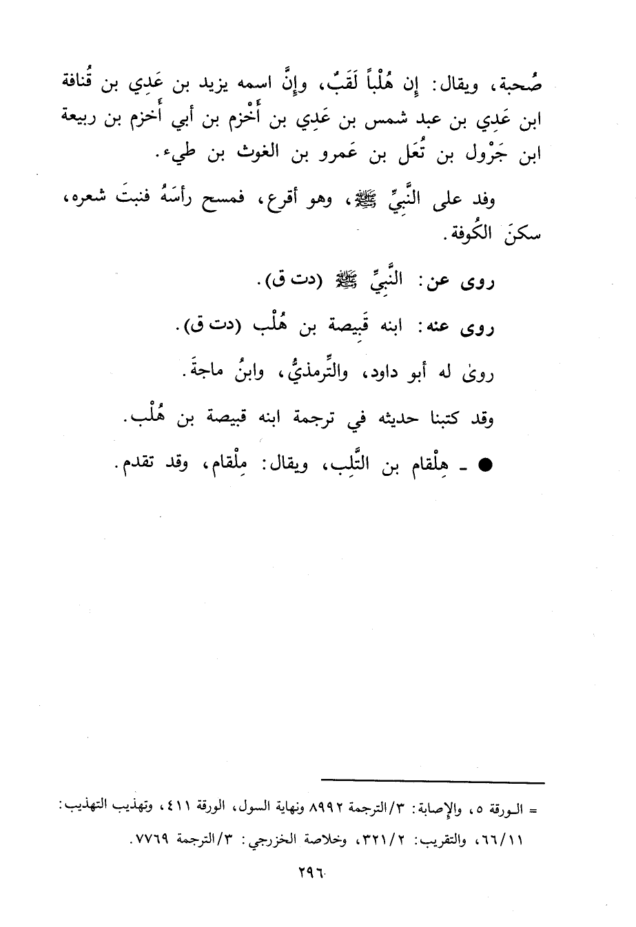 = الورقة 5، والاصابة: 3 / الترجمة 8992 ونهاية السول، الورقة 411، وتهذيب التهذيب: 11 / 66، والتقريب: 2 / 321، وخلاصة الخزرجي: 3 / الترجمة 7769.