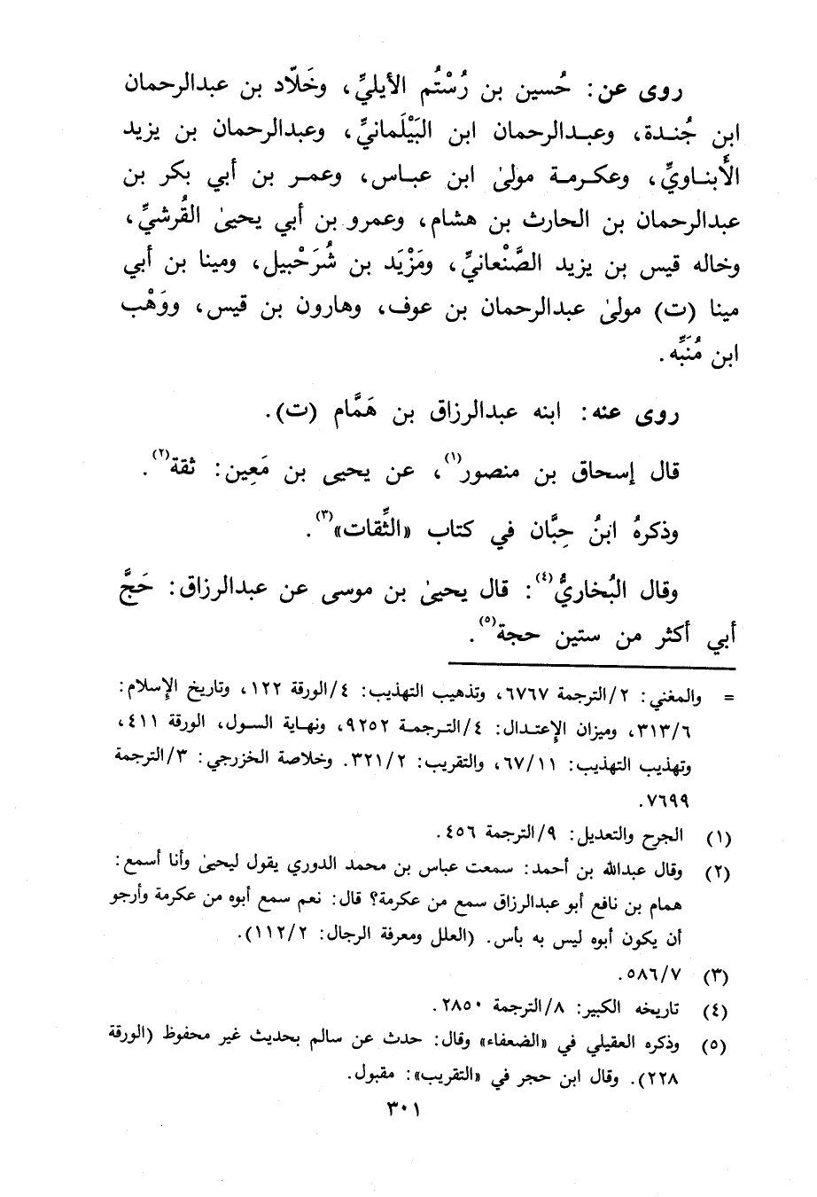 (2) وَقَال عَبد اللَّهِ بْن أَحْمَد: سمعت عباس بن محمد الدوري يقول ليحيى وأنا أسمع: همام بن نافع أبو عبد الرزاق سمع من عكرمة؟ قال: نعم سمع أبوه من عكرمة وأرجو أن يكون أبوه ليس به بأس. (العلل ومعرفة الرجال: 2 / 112) .