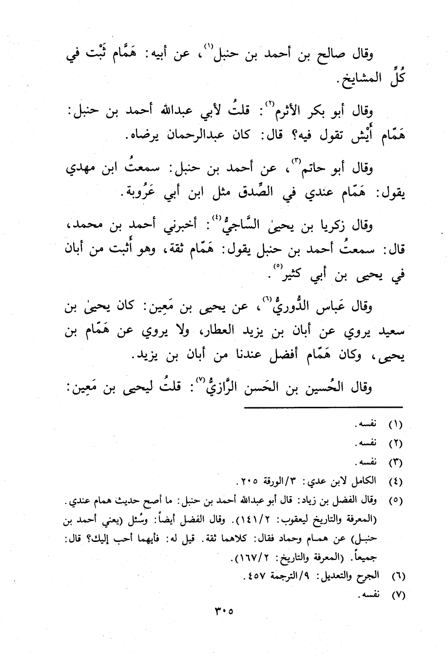 (المعرفة والتاريخ ليعقوب: 2 / 141) . وَقَال الفضل أيضا: وسئل (يعني أحمد بْن حنبل) عن همام وحماد فقال: كلاهما ثقة. قيل له: فأيهما أحب إليك؟ قال: جميعا. (المعرفة والتاريخ: 2 / 167) .