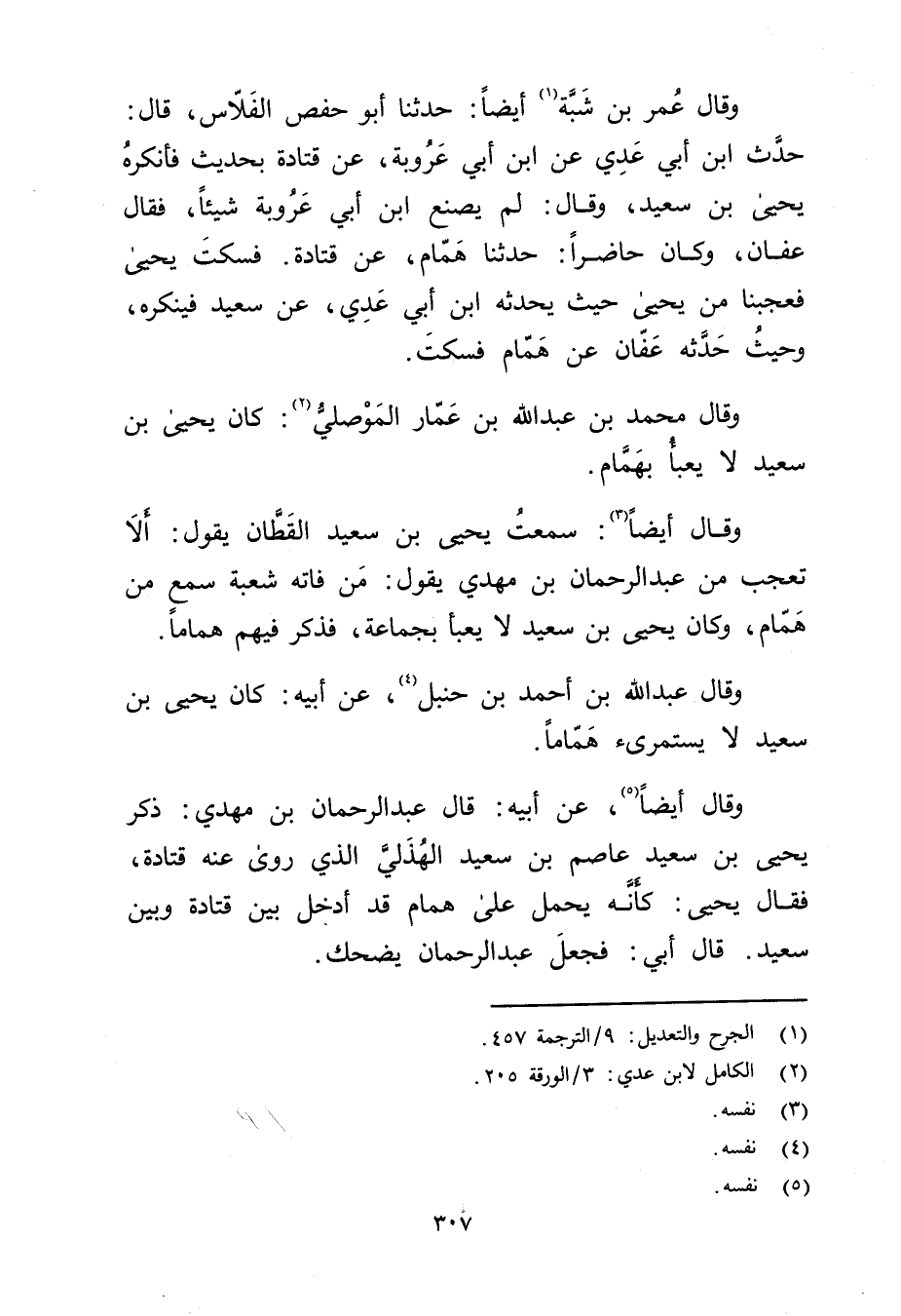 وَقَال أيضا (3) : سمعت يحيى بن سَعِيد القطان يقول: ألا تعجب من عَبْد الرحمن بْن مهدي يقول: من فاته شعبة سمع من همام، وكان يحيى بن سَعِيد لا يعبأ بجماعة، فذكر فيهم هماما.