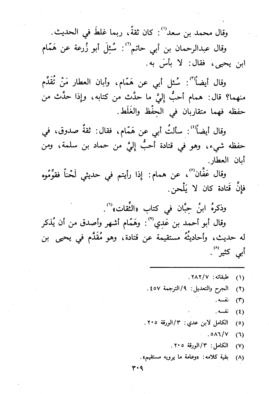 وَقَال أبو أحمد بن عدي (7) : وهمام أشهر وأصدق من أن يذكر له حديث، وأحاديثه مستقيمة عَنْ قتادة، وهو مقدم فِي يحيى بن أَبي كثير (8) .