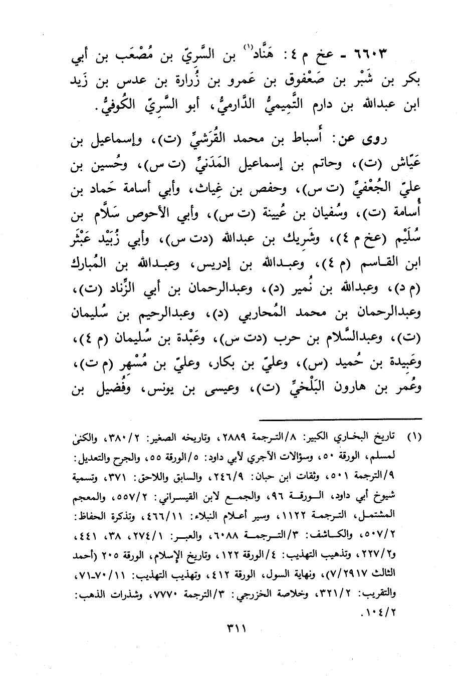 6603 - عخ م 4: هناد بن السري بن مصعب بن أَبي بَكْرِ بن شبر بن صعفوق بن عَمْرو بن زرارة بن عدس بن زيد ابن عَبد اللَّهِ بْنِ دارم التميمي الدارمي (1) ، أَبُو السري الكوفي.