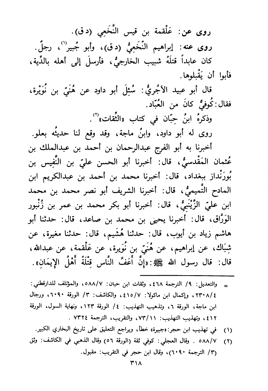 أخبرنا به أَبُو الْفَرِجِ عَبْدُ الرَّحْمَنِ بْنُ أَحْمَدَ بْنِ عَبد المَلِك بْنِ عُثْمَانَ الْمَقْدِسِيُّ، قال: أَخْبَرَنَا أَبُو الْحَسَنِ عَلِيُّ بْنُ النَّفِيسِ بْنِ بورندازَ بِبَغْدَادَ، قال: أَخْبَرَنَا مُحَمَّدُ بْنُ أحمد بن عبد الكريم ابن الْمَادِحِ التَّمِيمِيُّ، قال: أَخْبَرَنَا الشَّرِيفُ أَبُو نَصْرٍ مُحَمَّدُ بْنُ مُحَمَّدِ ابن عَلِيٍّ الزَّيْنَبِيُّ، قال: أخبرنا أَبُو بَكْرٍ مُحَمَّدُ بْنُ عُمَر بْنِ زُنْبُورٍ الْوَرَّاقُ، قال: أَخْبَرَنَا يَحْيَى بْن مُحَمَّد بْن صاعد، قال: حَدَّثَنَا أَبُو هَاشِمٍ زِيَادُ بْنُ أَيُّوبَ، قال: حَدَّثَنَا هُشَيْمٌ، قال: حَدَّثَنَا مُغِيرَةُ، عَنْ شِبَاكٍ، عَنْ إِبْرَاهِيمَ، عَنْ هُنَيِّ بْنِ نُوَيْرَةَ، عَنْ عَلْقَمَةَ، عَنْ عَبد اللَّهِ، قال: قال رَسُولُ اللَّهِ صلى اللَّهُ عَلَيْهِ وسَلَّمَ": إِنَّ أَعَفَّ الناس قتلة أهل الايمان.
