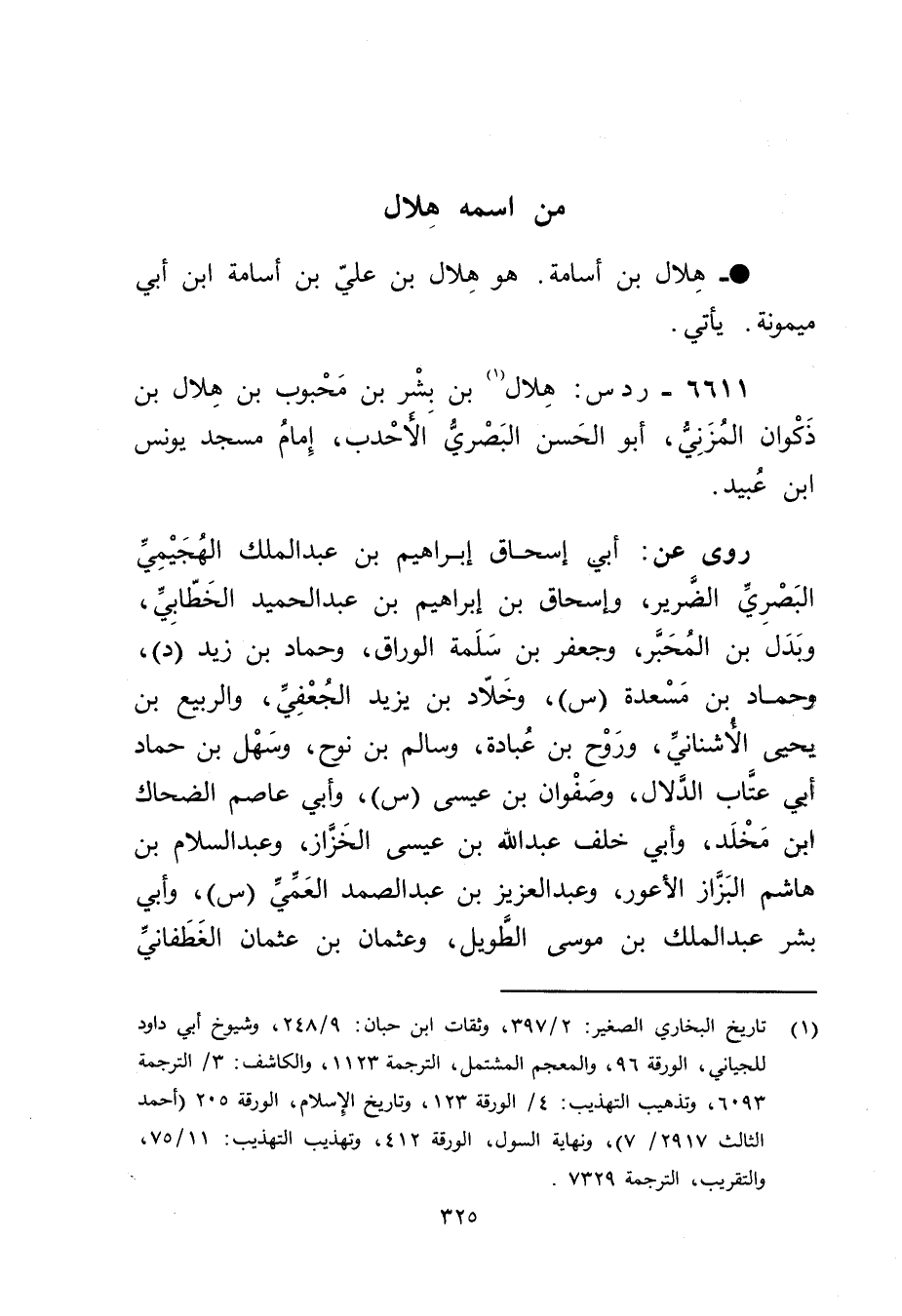 6611 - ر د س: هلال بن بشر بن محبوب بن هلال بن ذكوان المزني (1) ، أَبُو الحسن البَصْرِيّ الأحدب، إمام مسجد يونس ابن عُبَيد.