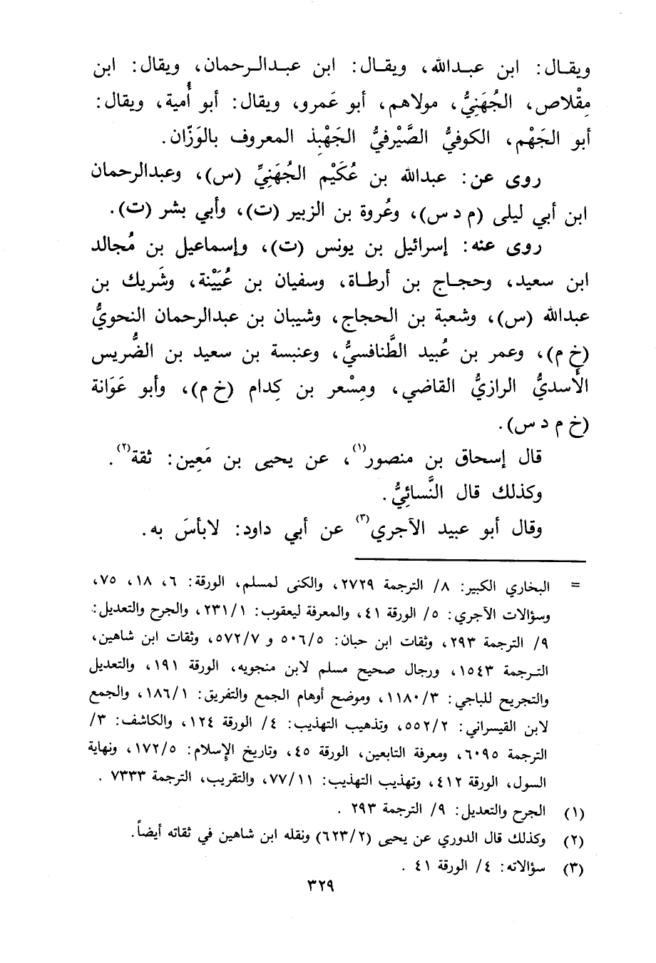 وسؤالات الآجُرِّيّ: 5 / الورقة 41، والمعرفة ليعقوب: 1 / 231، والجرح والتعديل: 9 / الترجمة 293، وثقات ابن حبان: 5 / 506 و7 / 572، وثقات ابن شاهين، الترجمة 1543، ورجال صحيح مسلم لابن منجويه، الورقة 191، والتعديل والتجريح للباجي: 3 / 1180، وموضح أوهام الجمع والتفريق: 1 / 186، والجمع لابن القيسراني: 2 / 552، وتذهيب التهذيب: 4 / الورقة 124، والكاشف: 3 / الترجمة 6095، ومعرفة التابعين، الورقة 45، وتاريخ الاسلام: 5 / 172، ونهاية السول، الورقة 412، وتهذيب التهذيب: 11 / 77، والتقريب، الترجمة 7333.