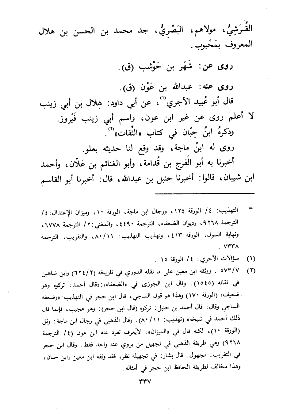 (2) 7 / 573. ووثقه ابن مَعِين على ما نقله الدوري في تاريخه (2 / 624) وابن شاهين في ثقاته (1545) . وَقَال ابن الجوزي في " الضعفاء": قال أحمد: تركوه وهو ضعيف" (الورقة 170) وهذا هو قول الساجي، قال ابن حجر في التهذيب: وضعفه الساجي وَقَال: قال أحمد بن حنبل: تركوه (قال ابن حجر) : وهو عجيب، فإنما قال ذلك أحمد في شيخه" (تهذيب: 11 / 80) . وَقَال الذهبي في رجال ابن ماجة: وثق (الورقة 10) ، لكنه قال في " الميزان": لا يعرف تفرد عنه ابن عون (4 / الترجمة 9268) وهي طريقة الذهبي في تجهيل من يروي عنه واحد فقط. وَقَال ابن حجر في التقريب: مجهول. قال بشار: في تجهيله نظر، فقد وثقه ابن مَعِين وابن حبان، وهذا مخالف لطريقة الحافظ ابن حجر في أمثاله.