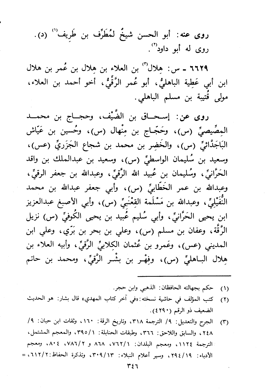 6629 - س: هلال بن العلاء بن هلال بن عُمَر بن هلال ابن أَبي عطية الباهلي (3) ، أَبُو عُمَر الرَّقِّيّ، أخو أحمد بن العلاء، مولى قتيبة بن مسلم الباهلي.