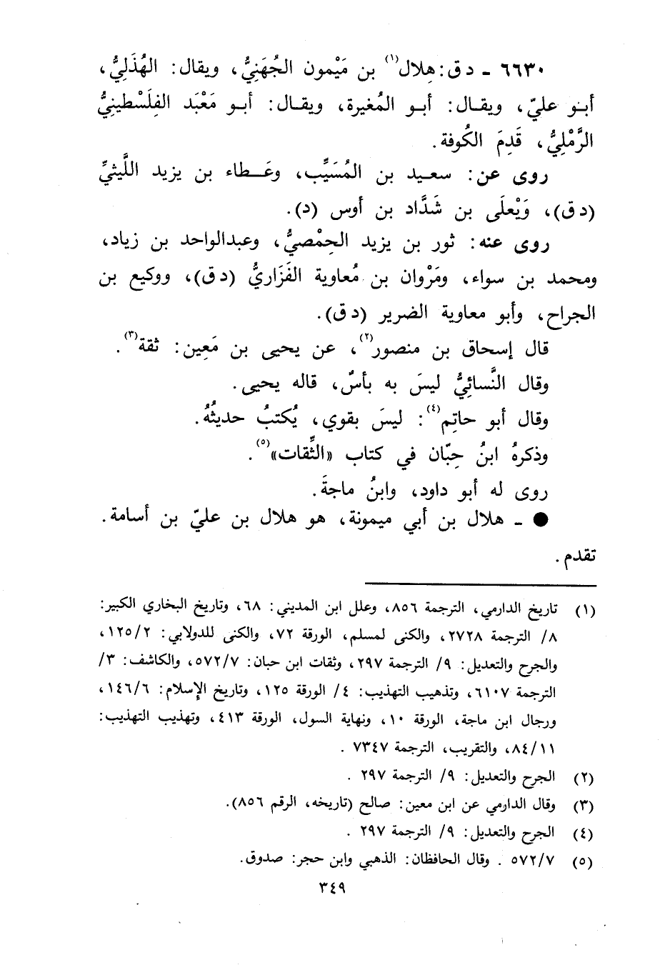6630 - د ق: هلال بن ميمون الجهني (1) ، ويُقال: الهذلي، أَبُو علي، ويُقال: أَبُو المغيرة، ويُقال: أَبُو معبد الفلسطيني الرملي، قدم الكوفة.
