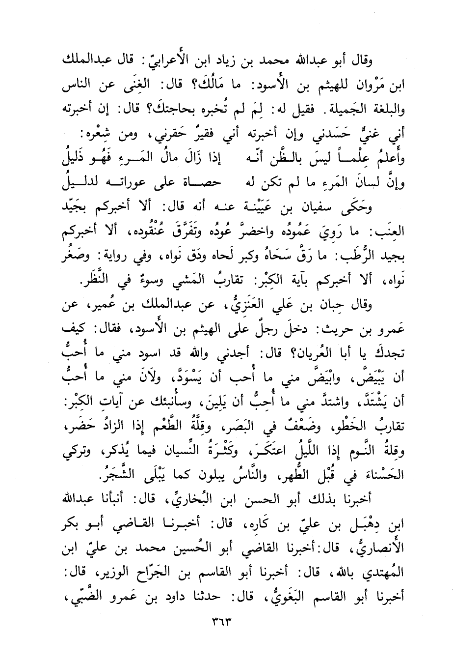 وَقَال أَبُو عَبْد اللَّهِ مُحَمَّد بن زياد ابن الاعرابي: قال عَبد المَلِك ابن مروان للهيثم بن الأسود: ما مالك؟ قال: الغنى عَنِ الناس والبلغة الجميلة. فقيل له: لم لم تخبره بحاجتك؟ قال: إن أخبرته أني غني حسدني وإن أخبرته أني فقير حقرني، ومن شعره: وأعلم علما ليس بالظن أنه • إذا زال مال المرء فهو ذليل وإن لسان المرء ما لم تكن له • حصاة عَلَى عوراته لدليل.