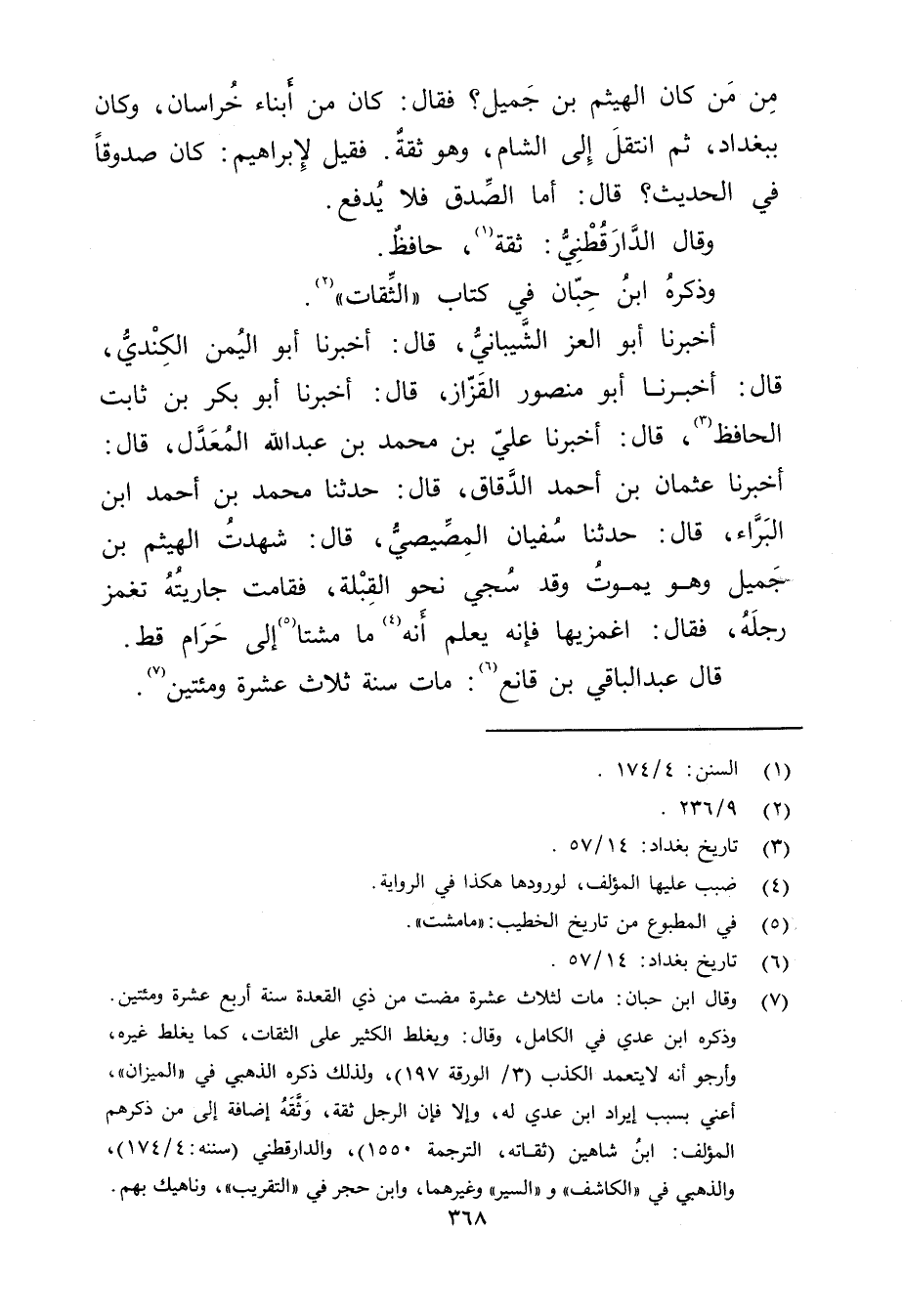أَخْبَرَنَا أَبُو الْعِزِّ الشَّيْبَانِيُّ، قال: أَخْبَرَنَا أَبُو اليُمْنِ الْكِنْدِيُّ، قال: أَخْبَرَنَا أَبُو مَنْصُورٍ الْقَزَّازُ، قال: أَخْبَرَنَا أَبُو بَكْرِ بْنُ ثَابِتٍ الْحَافِظُ (3) ، قال: أَخْبَرَنَا علي بْن مُحَمَّد بْن عَبد الله المعدل، قال: أَخْبَرَنَا عثمان بْن أحمد الدقاق، قال: حَدَّثَنَا مُحَمَّد بْن أَحْمَدَ بن البراء، قال: حَدَّثَنَا سفيان المصيصي، قال: شهدت الهيثم بن جميل وهو يموت وقد سجي نحو القبلة، فقامت جاريته تغمز رجله، فَقَالَ: اغمزيها فإنه يعلم أنه (4) ما مشتا (5) إِلَى حرام قط.