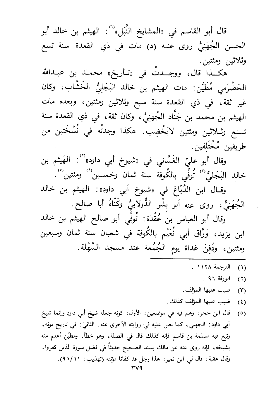 (5) قال ابن حجر: وهم فيه في موضعين: الاول: كونه جعله شيخ أبي داود وإنما شيخ أبي داود: الجهني، كما نص عليه في روايته الاخرى عنه. الثاني: في تاريخ موته، وتبع فيه مسلمة بن قاسم فإنه كذلك قال في الصلة، وهو خطأ، ومطين أعلم منه بشيخه، فإنه روى عنه عن مالك بسند الصحيح حديثًا في فضل سورة الذين كفروا، وَقَال عقبة: قال لي ابن نمير: هذا رجل قد كفانا مؤنته (تهذيب: 11 / 95) .