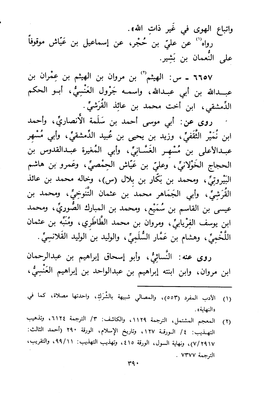 6657 - س: الهيثم (2) بن مروان بن الهيثم بْن عِمْران بْن عَبد الله بْن أَبي عَبد اللَّهِ، واسمه جرول العنسي، أَبُو الحكم الدمشقي، ابن أخت محمد بن عائذ القرشي.
