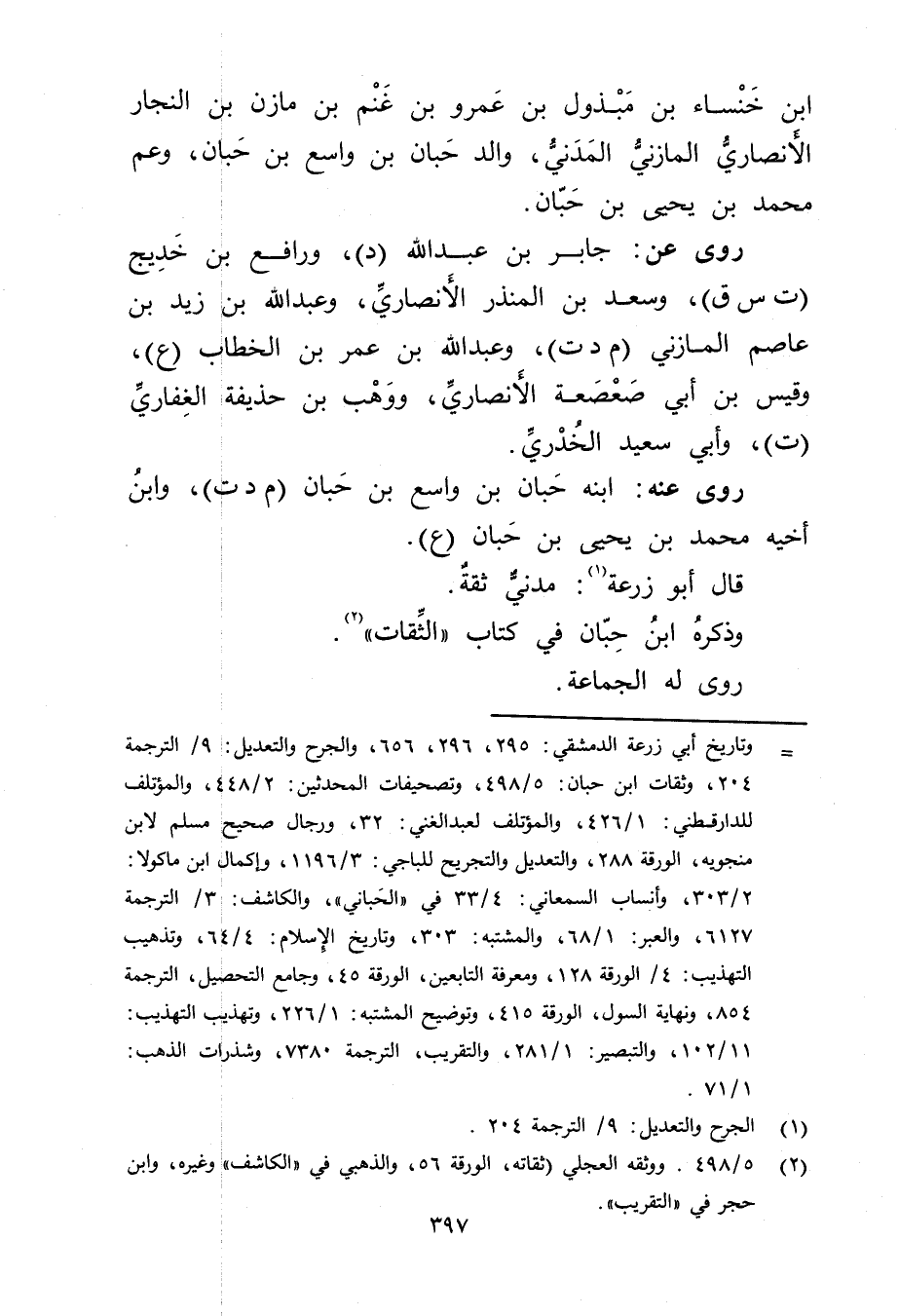 = وتاريخ أبي زرعة الدمشقي: 295، 296، 656، والجرح والتعديل: 9 / الترجمة 204، وثقات ابن حبان: 5 / 498، وتصحيفات المحدثين: 2 / 448، والمؤتلف للدار قطني: 1 / 426، والمؤتلف لعبد الغني: 32، ورجال صحيح مسلم لابن منجويه، الورقة 288، والتعديل والتجريح للباجي: 3 / 1196، وإكمال ابن ماكولا: 2 / 303، وأنساب السمعاني: 4 / 33 في " الحباني"، والكاشف: 3 / الترجمة 6127، والعبر: 1 / 68، والمشتبه: 303، وتاريخ الاسلام: 4 / 64، وتذهيب التهذيب: 4 / الورقة 128، ومعرفة التابعين، الورقة 45، وجامع التحصيل، الترجمة 854، ونهاية السول، الورقة 415، وتوضيح المشتبه: 1 / 226، وتهذيب التهذيب: 11 / 102، والتبصير: 1 / 281، والتقريب، الترجمة 7380، وشذرات الذهب: 1 / 71.