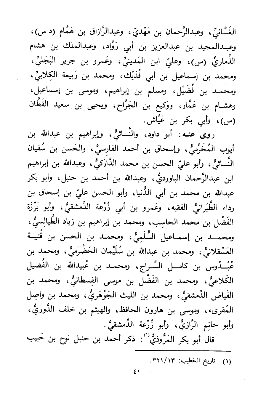 الغساني، وعَبْد الرَّحْمَنِ بن مهدي، وعبد الرزاق بن همام (دس) ، وعبد المجيد بْن عَبْد الْعَزِيزِ بْن أَبي رواد، وعبد الملك بن هشام الذماري (س) ، وعلي ابن المديني، وعَمْرو بن جرير البجلي، ومحمد بْن إِسْمَاعِيل بْن أَبي فديك، ومحمد بْن ربيعة الكِلابي، ومحمد بْن فضيل، ومسلم بْن إبراهيم، وموسى بن إسماعيل، وهشام بْن عمار، ووكيع بْن الجراح، ويحيى بْن سَعِيد القطان (س) ، وأبي بَكْر بْن عياش.
