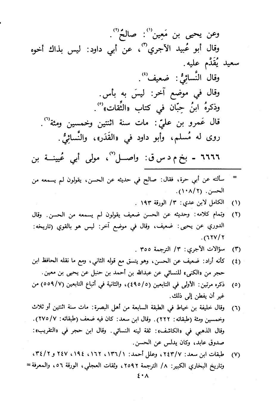 (6) وَقَال خليفة بن خياط في الطبقة السابعة من أهل البصرة: مات سنة اثنتين أو ثلاث وخمسين ومئة (طبقاته: 222) . وَقَال ابن سعد: كان فيه ضعف (طبقاته: 7 / 275) . وَقَال الذهبي في " الكاشف": ثقة لينه النَّسَائي. وَقَال ابن حجر في "التقريب": صدوق عابد، وكان يدلس عن الحسن.