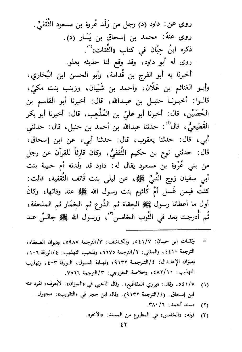 أخبرنا بِهِ أَبُو الْفَرَجِ بْنُ قُدَامَةَ، وأبو الحسن بْن البخاري، وأبو الغنائم بْن علان، وأحمد بْن شَيْبَانَ، وزَيْنَبُ بِنْتُ مَكِّيٍّ، قَالُوا: أَخْبَرَنَا حنبل بْن عَبد الله، قال: أَخْبَرَنَا أبو القاسم بْن الحصين، قال: أَخْبَرَنَا أبو علي بْن المذهب، قال: أَخْبَرَنَا أبو بَكْرٍ القَطِيعِيّ، قال (2) : حَدَّثَنَا عَبد اللَّهِ بْن أَحْمَد بْن حنبل، قال: حَدَّثني أبي، قال: حَدَّثَنَا يعقوب، قال: حَدَّثَنَا أبي، عَنِ ابْنِ إِسْحَاقَ، قال: حَدَّثَنِي نُوحُ بن حكيم الثقفي، وكان قارئا لِلْقُرْآنِ عَنْ رَجُلٍ مِنْ بَنِي عُرْوَةَ بْنِ مَسْعُودٍ يُقَالُ لَهُ: دَاوُدُ قَدْ ولَّدَتْهُ أُمُّ حَبِيبَةَ بنت أبي سُفْيَان زوج النَّبِيّ صَلَّى اللَّهُ عَلَيْهِ وسَلَّمَ، عَن لَيْلَى بِنْتِ قَانِفٍ الثَّقَفِيَّةِ، قَالَتْ: كنت فيمن غسل أم كلثوم بنت رَسُول اللَّهِ صَلَّى اللَّهُ عَلَيْهِ وسَلَّمَ عِنْدَ وفَاتِهَا، وكَانَ أول ما أعطانا رَسُولَ صَلَّى اللَّهُ عَلَيْهِ وسَلَّمَ الْحِقَاءَ ثُمَّ الدِّرْعَ ثُمَّ الْخِمَارَ ثُمَّ الْمِلْحَفَةَ، ثُمَّ أُدْرِجَتْ بَعْدُ فِي الثَّوْبِ الْخَامِسِ (3) ، ورَسُولُ اللَّهِ صَلَّى اللَّهُ عَلَيْه وسَلَّمَ جَالِسٌ عند