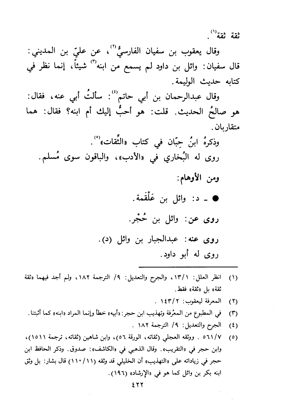 (5) 7 / 561. ووثقه العجلي (ثقاته، الورقة 56) ، وابن شاهين (ثقاته، ترجمة 1511) ، وابن حجر في "التقريب". وَقَال الذهبي في " الكاشف": صدوق. وذكر الحافظ ابن حجر في زياداته على" التهذيب" أن الخليلي قد وثقه (11 / 110) قال بشار: بل وثق ابنه بكر بن وائل كما هو في " الارشاد" (196) .