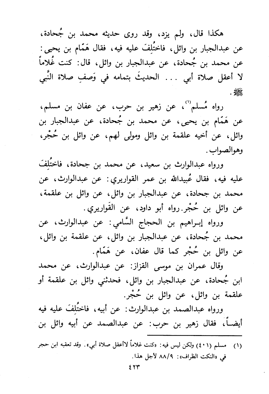 رواه مسلم (1) ، عَنْ زُهَيْرِ بْنِ حَرْبٍ، عَنْ عَفَّانَ بْنِ مُسْلِمٍ، عَنْ هَمَّامٍ بْن يَحْيَى، عَنْ مُحَمَّد بْن جحادة، عَنْ عبد الجبار بن وائل، عَنْ أخيه علقمة بن وائل ومولى لهم، عَنْ وائل بن حجر، وهو الصواب.