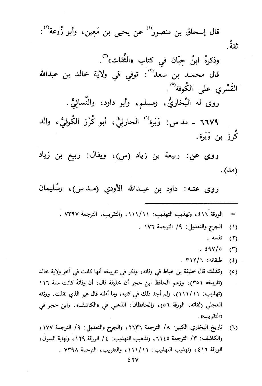 (5) وكذلك قال خليفة بْن خياط في وفاته، وذكر في تاريخه أنها كانت في آخر ولاية خالد (تاريخه 351) ، وزعم الحافظ ابن حجر أن خليفة قال: أن وفاته كانت سنة 116 (تهذيب: 11 / 111) ، ولم أجد ذلك في كتبه، وما أظنه قال غير الذي نقلت. ووثقه العجلي (ثقاته، الورقة 56) ، والحافظان: الذهبي في " الكاشف"، وابن حجر في "التقريب.